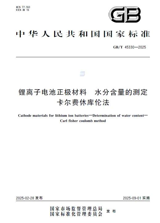 近期,國家市場監(jiān)督管理總局正式發(fā)布《GB/T 45330-2025鋰離子電池正極材料 水分含量的測定 卡爾費休庫倫法》新國標(biāo),這是我國首個專門針對鋰離子電池正極材料水分含量測試的國家標(biāo)準(zhǔn),該標(biāo)準(zhǔn)將于2025年9月1日正式實施。